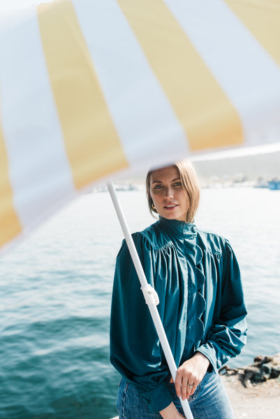 The Teal Scallop Jacket captures the harmony between structure and flow.