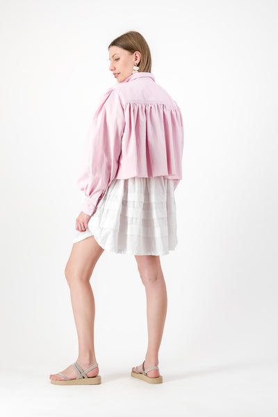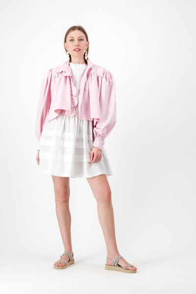 Delicate details define its charm — a soft frill neckline, tiered pleated skirt, and gently puffed sleeves finished with elastic hems. The open back with dainty tie details adds a playful balance to its refined silhouette, while side pockets keep it easy for everyday wear.