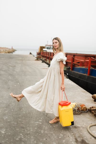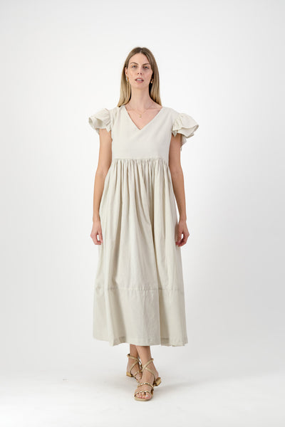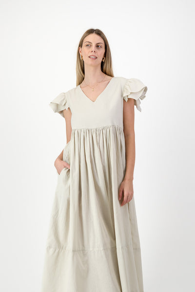 With fluttering frill sleeves, a flowing long skirt, and a gently shaped V-neckline, this piece carries an understated grace that feels timeless. The lined bodice offers a smooth, comfortable fit, while the cotton-linen blend allows it to breathe and move with you. Side pockets add a thoughtful, everyday touch.