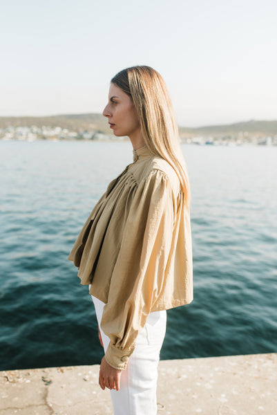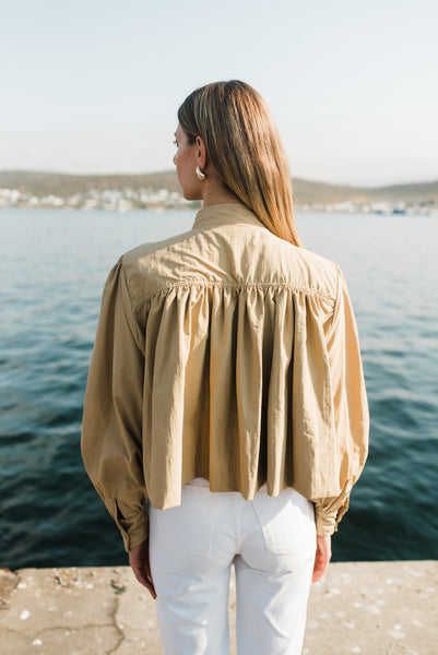 Long puff sleeves taper neatly into cuffs, while topstitching along the yoke reveals meticulous craftsmanship. Fully lined for comfort, it’s the perfect modern layer — quietly bold, endlessly versatile.