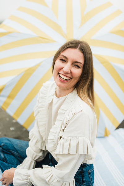 The cascading frill details along the bodice and sleeves add rhythm to the silhouette, while the long elastic-bell sleeves invite playful styling — push them up for a gathered, casual look or wear them long for subtle drama. Finished with a clean back zip, this piece transitions seamlessly across seasons — elegant with tailored trousers, relaxed with denim.