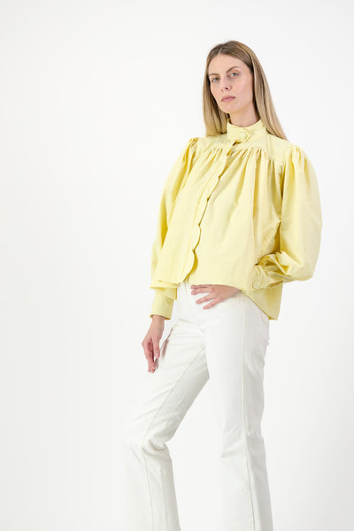 Billowing sleeves taper into precise cuffs, framed by subtle topstitching along the front and back yoke. Fully lined for polished structure, it’s the embodiment of warm optimism and refined ease.