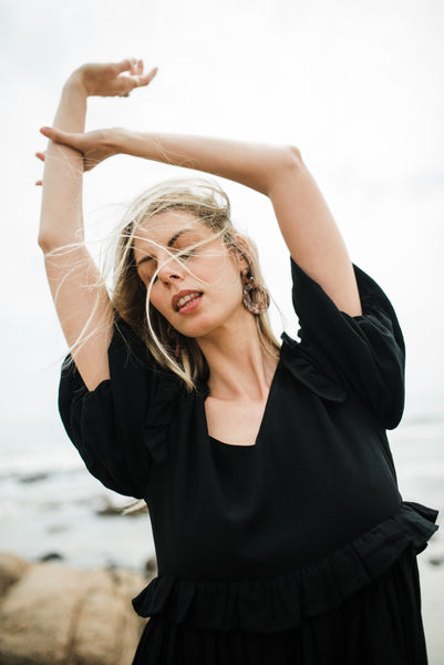 In a deep black hue, this piece captures the calm beauty of still evenings — elegant, understated, and endlessly wearable.