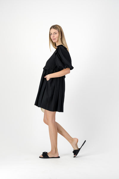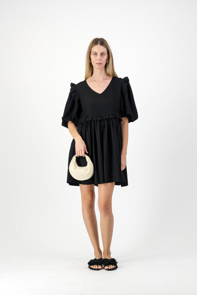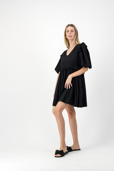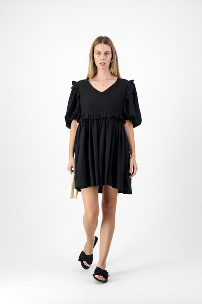 Crafted from a soft linen-blend fabric, it features gentle puff sleeves, frill details along the shoulder and waist, and a flattering V-neckline. The bodice and sleeves are fully lined for comfort, while the straight hem and loose silhouette create a flow that feels as effortless as it looks.