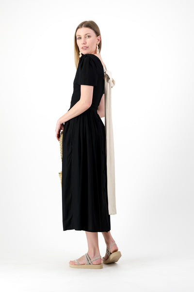 Designed with a refined, more covered back and a long oatmeal bow that trails like moonlight against dusk, this dress balances softness with structure. The straight-hem sleeves and fitted bodice meet a full gathered skirt that moves with gentle rhythm.