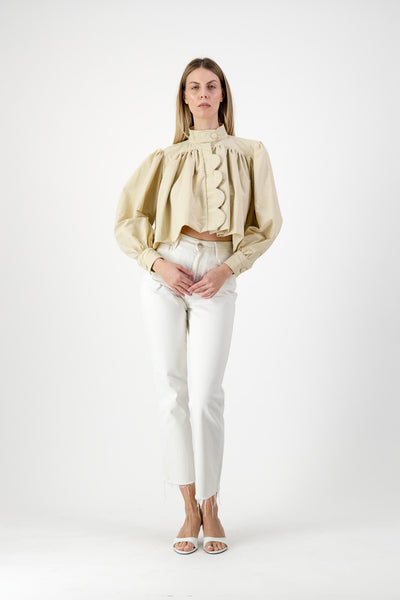A structured stand collar and sculpted flap detail lend balance and intention, while the puff sleeves taper into soft cuffs — an ode to effortless grace.