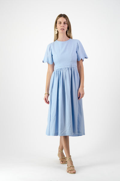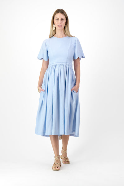 The scallop-edged sleeves add charm and rhythm, fluttering gently as you move. The gathered skirt and lined bodice create a balanced silhouette, blending playfulness with quiet grace. Covered buttons and hidden pockets make every detail feel intentional — calm design made for slow living.