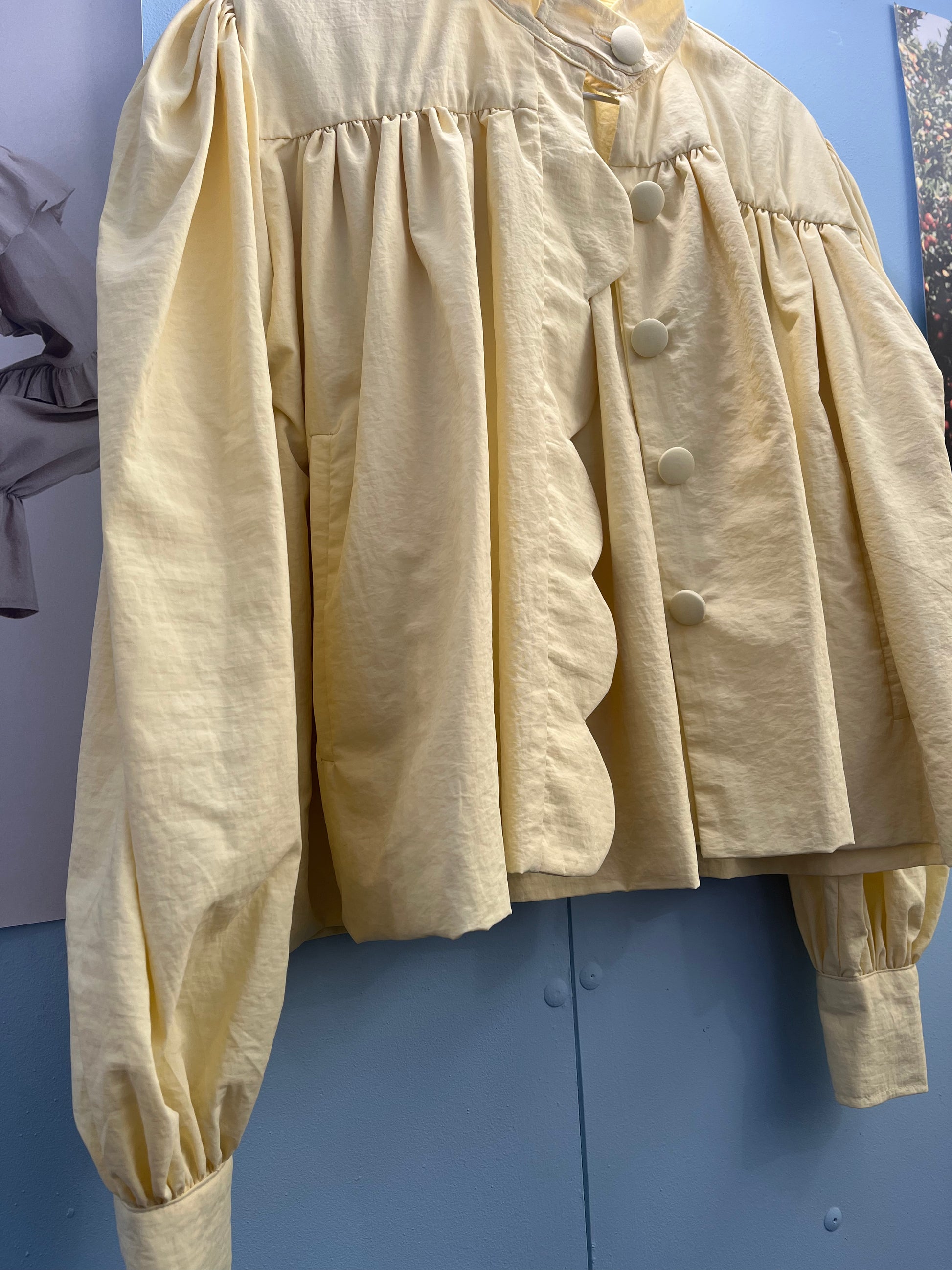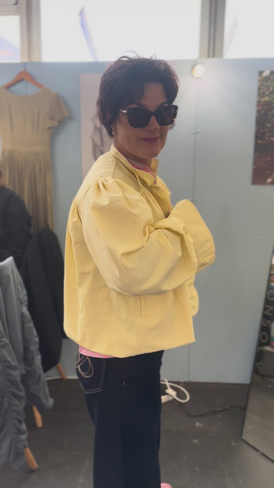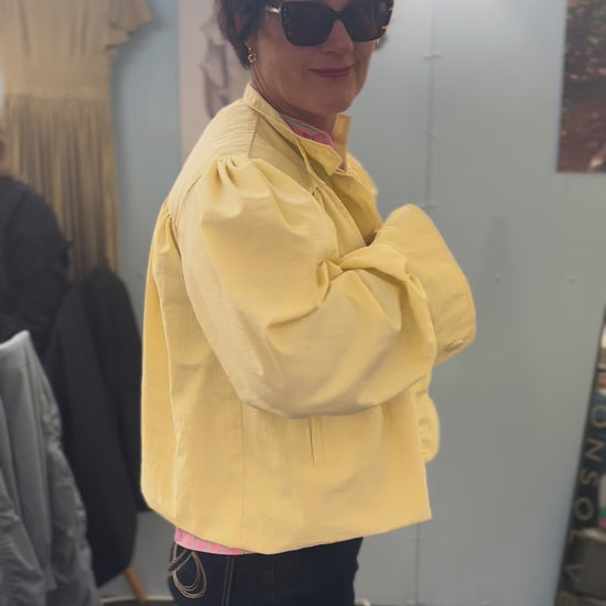 A modern twist on timeless elegance. This jacket is crafted from crisp Taslon, designed with a slightly cropped, gathered silhouette that flatters while keeping it chic and effortless. The standout details include softly gathered sleeves with refined cuffs, fabric-covered buttons at both the cuffs and front, and a hidden scalloped button stand for a subtle yet striking touch. Finished with a beautifully structured high collar, it’s the perfect lightweight layer for in-between seasons — versatile, feminine, and endlessly stylish.