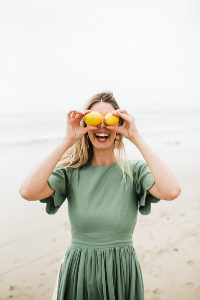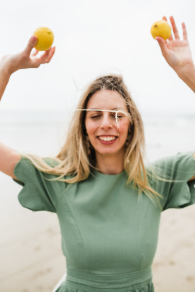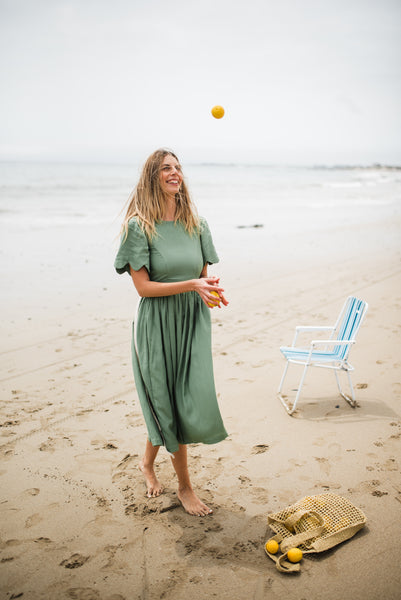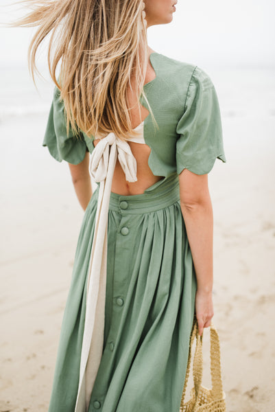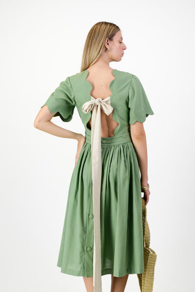 Its sculpted scallop sleeves and open-back detail trace the contours of nature’s own lines — effortless, imperfect, and intentional. A long oatmeal tie falls from the back bow, softening the strength of its form. With a fitted bodice, covered buttons, side pockets, and full lining through the top, this piece is as easy to wear as it is poetic in presence.